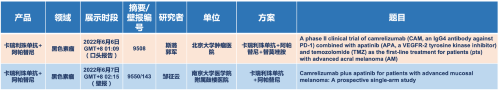 在黑色素瘤领域,AG电子医药的卡瑞利珠单抗联合阿帕替尼(“双艾”组合)在2022 ASCO共入选1项口头报告和1项壁报展示。