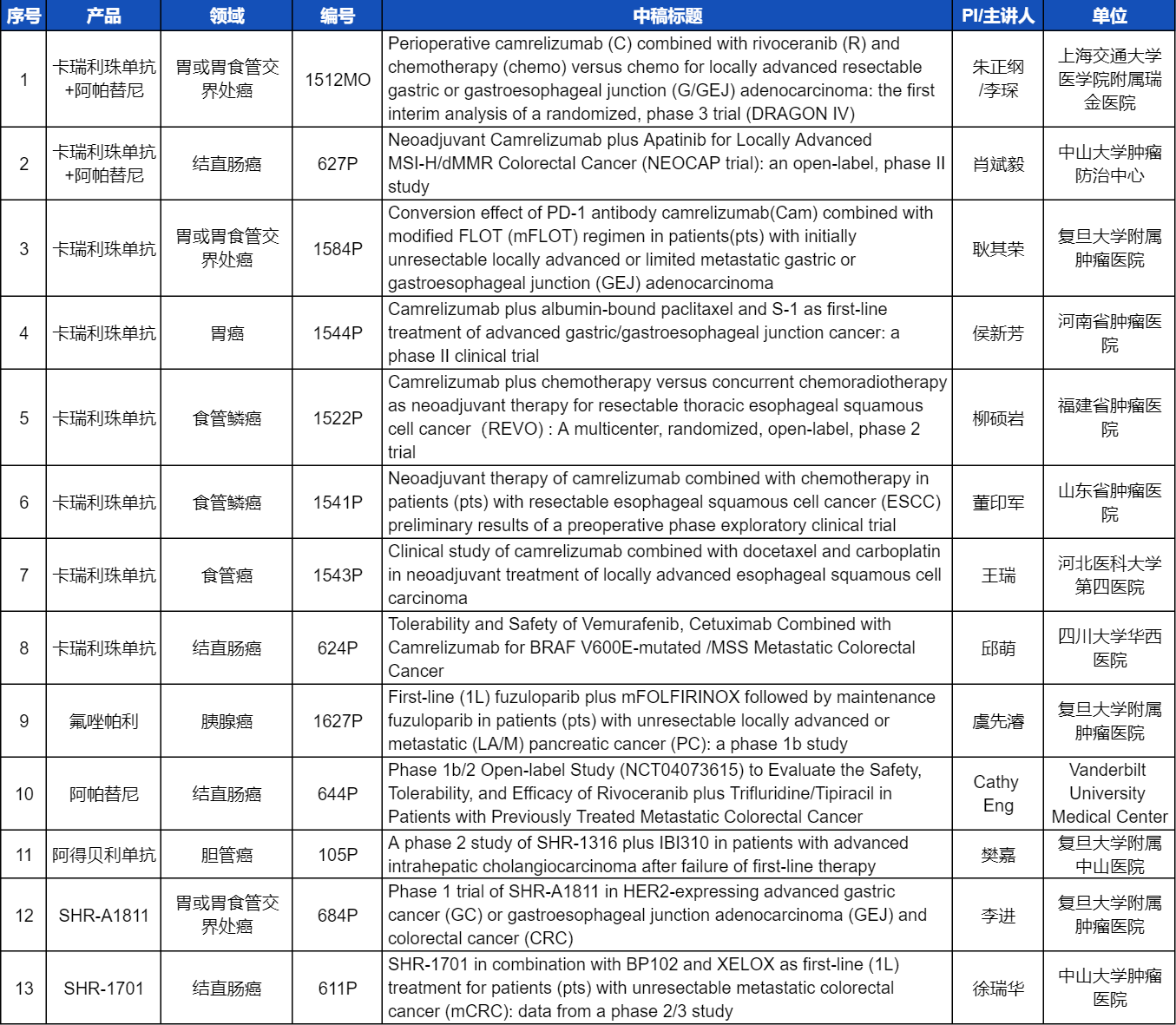 在消化系统肿瘤领域,AG电子创新产品相关研究共入选1项口头报告和12项壁报展示。除了经典的明星药物卡瑞利珠单抗和阿帕替尼,SHR-A1811、SHR-1701等未上市创新产品也有相应研究入选。此外,阿得贝利单抗、氟唑帕利等已上市药物也在积极探索新的适应症,本次ESMO大会分别有肝内胆管癌和胰腺癌相关研究入选。这些新老药物前沿研究的不断出现,有望为消化系统肿瘤患者带来新的福音!