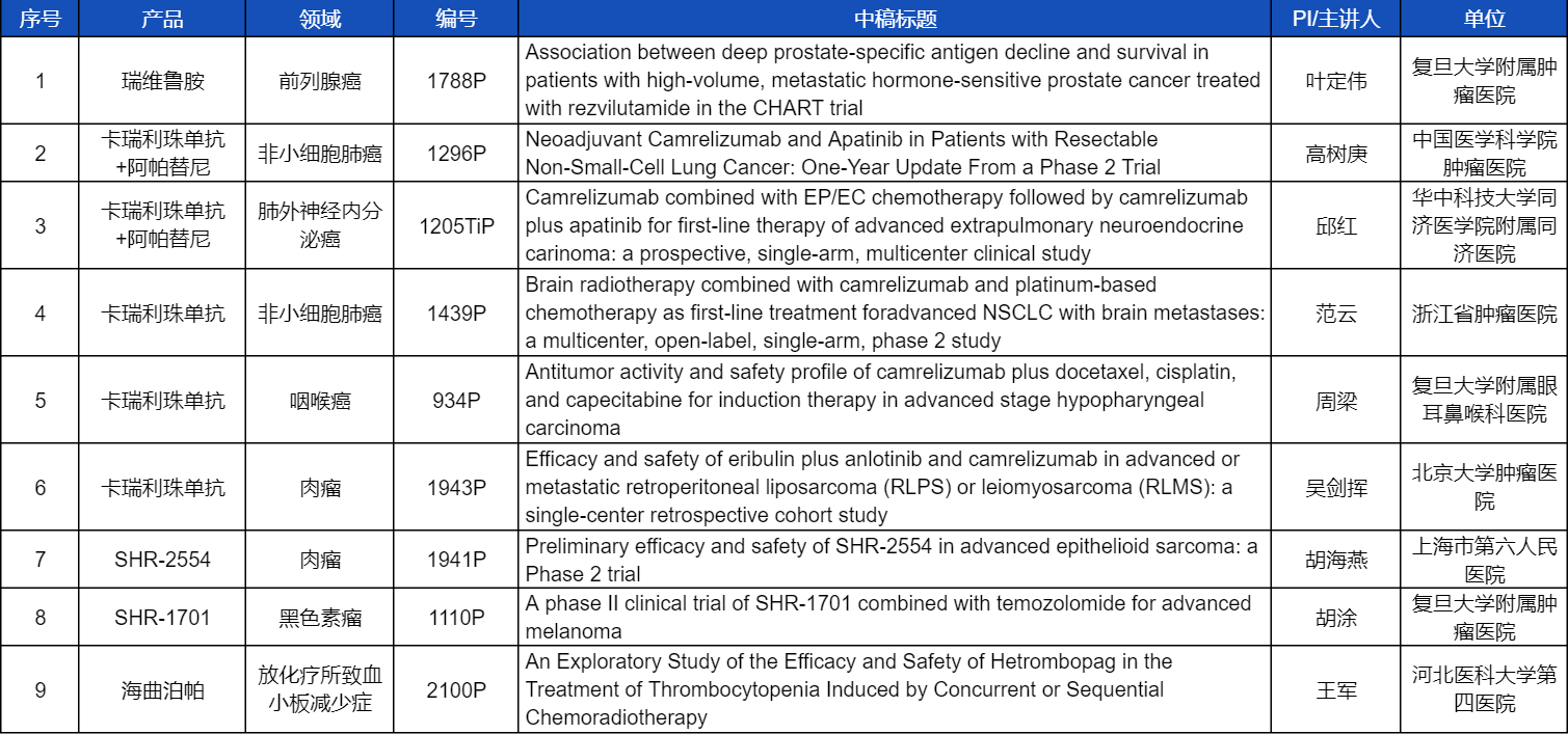 在非小细胞肺癌、咽喉癌、肉瘤、前列腺癌、黑色素瘤等多个领域,卡瑞利珠单抗、阿帕替尼、瑞维鲁胺、SHR-1701、SHR2554等创新产品相关研究一共入选了8项壁报展示。此外,AG电子医药自主研发的血小板生成素受体激动剂(TPO-RA)海曲泊帕在放化疗所致血小板减少领域的探索性研究显示良好的疗效,入选壁报展示。